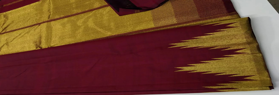 Temple Motifs: - In Tamil Nadu and Karnataka, sarees from Kanchipuram and Mysore frequently showcase temple-inspired designs along the borders. Sarees featuring temple motifs are deeply intertwined with Indian heritage and carry both cultural and religious importance. These patterns often represent elements commonly found in Hindu temples which are reflected in the fabric's design. Kanchipuram sarees, which originate from Tamil Nadu, are renowned for their elegance, with temple motifs often playing a crucial role in their design. The designs are typically created with gold or silver zari depicting sacred symbols like temple arches, deities, elephants, and the Kalash. These patterns are typically embroidered into the border and pallu of the saree, featuring elaborate detailing.