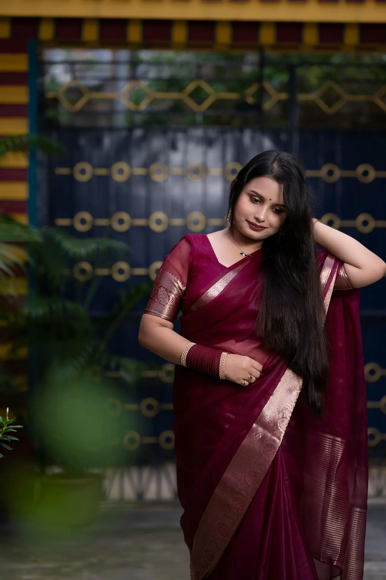 This modern style of saree brings together the shine knitting of tissue and the flowy drape of chiffon. Lightweight and modish, these sarees are very popular among new generations.