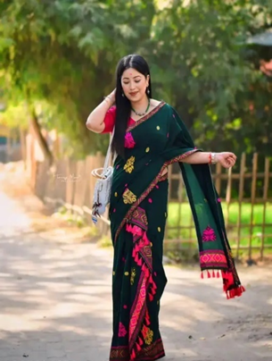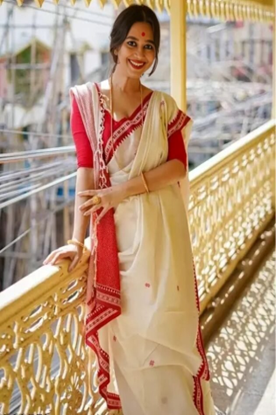 Assam Drape Saree: The Assam saree drape of Mekhla Sador is the traditional Assamese dress that is originated from Riha, a cloth that used to drape the entire body including the head but leaving the face exposed. Mekhla Chador/Sador which is assembled from Assam carried its tradition from the Ahom rules in the 13th to 19th century. The women wear sarees in two parts the upper part is known as Chador/Sador and the lower part is known as Mekhla. This Mekhla Sador is made up of silk such as Muga, and Pat silk with attractive patterns and motifs. This is famous attire for the Assamese in their wedding. The designs in the Mekhla are inspired by nature, culture and mythological stories that enhance the beauty of the saree and make the saree more attractive.